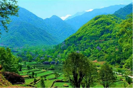 村邊有溪澗蜿蜒而下。小溪發(fā)源于遠處的雪山,溪水清澈,冰涼徹骨,嘩嘩有聲。沿溪而上,兩側(cè)古樹林立,歷經(jīng)幾百年的歲月洗禮,依舊蒼勁而有蓬勃的生命力,枝葉發(fā)新,青綠疊翠。