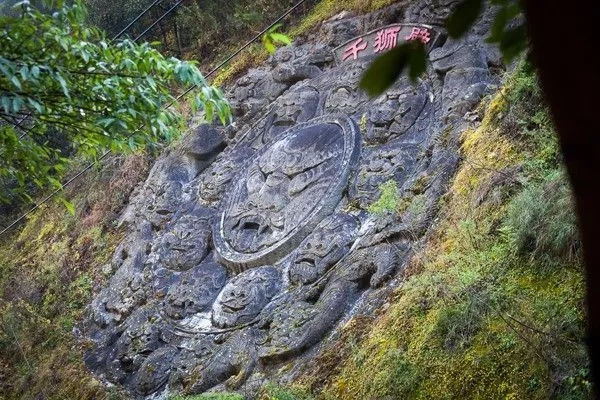 從“憩亭”往東邊所看到大石壁上氣勢宏偉的群獅雕刻,就是千獅山的千獅壁。石壁中間的這個圓形構(gòu)圖,其創(chuàng)意來源于繡球,其中9個獅子頭代表東漢以來9個朝代獅子的不同風(fēng)格,象征獅子在中國發(fā)展的歷程。千獅壁還沒有雕完,完工之時將有一千只石獅子在巨大的石壁上共舞,那時該是多么壯觀的場面。