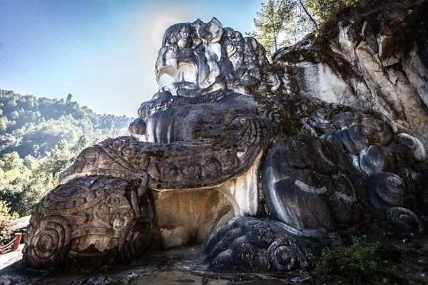 千獅坊 千獅坊為步入千獅山的第一座石坊,坊前有形態(tài)各異、群獅競秀的迎賓獅。該坊可以說是世界上雕刻獅子最多的石坊,石坊從坊頂、斗拱、瓦當(dāng)、滴水、雀替、掛枋、抱鼓到基座上,雕有坐獅、立獅、浮雕獅、圖案獅等足足一千只獅子。石坊正面題刻有取自草圣王羲之書法的“路入嫏嬛”四字大書。“嫏嬛”是我國古代神話中天皇藏書的地方,就是所謂的仙境,道教把幽靜的道觀也稱為“嫏嬛”。 “路入嫏嬛”意即步入千獅坊,就到了仙境。從這兒朝山下俯瞰,正如石坊背面所題刻的“一望云深”,云深之處就是美麗的劍川壩子。