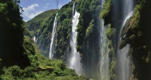 進(jìn)入谷底,沿著一側(cè)的小路前行,一會(huì)兒又有另一處瀑布映入眼中,其水勢(shì)雖不及之壯觀,但卻有著黃果樹瀑布沒有的綽約。瀑布成三股水流從崖頭沖下,先是垂直而落,繼爾跌落在一大塊凸凹不平的巖壁上,分化成幾股細(xì)流,又向下沖去。