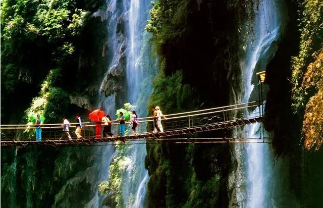 可能是萬年前的某次地殼運(yùn)動(dòng),馬嶺河形成了一個(gè)深深的峽谷地縫。從地面上下到谷底,可乘觀光電梯,但是沿著依次而下的臺(tái)階小路行走更是別有情趣。在闃寂的峽谷里,自己稍露怯意的足音早已被谷底溪水的奔騰聲、峭壁上飛流直下的瀑布的轟鳴聲所吞沒。