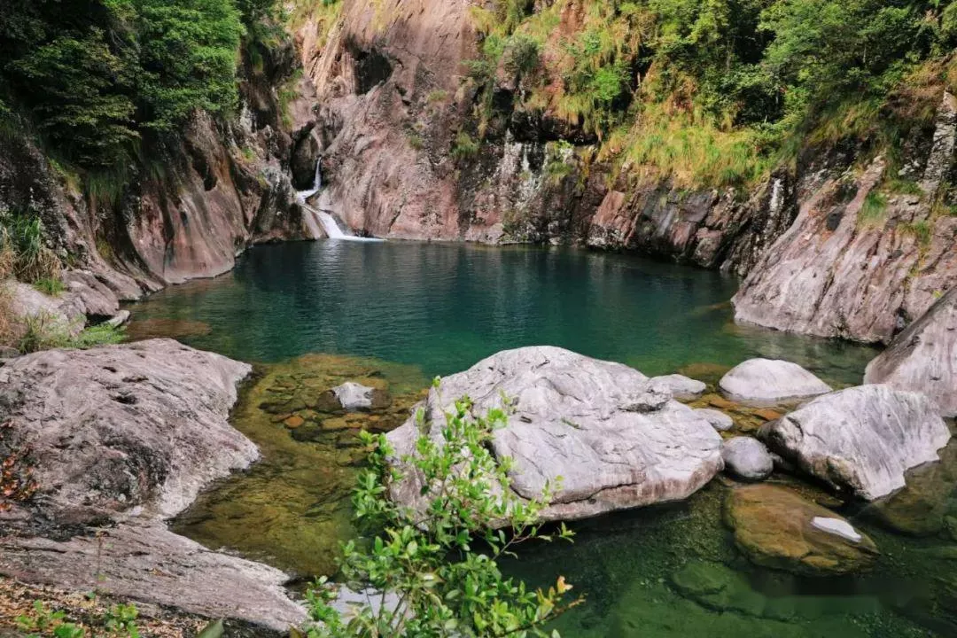 被壺穴瀑布搶去風頭的碧潭翠溪也是這里的亮點,有“瑤池”之稱,又有“小九寨”之名。這種借名的稱呼被用得太多,往往看到實景會失望,但銅鈴山是真配得上這些名稱,水色蒼碧如玉,綠樹倒影成景,溪水清澈見底,偶見彩魚悠然嬉戲。