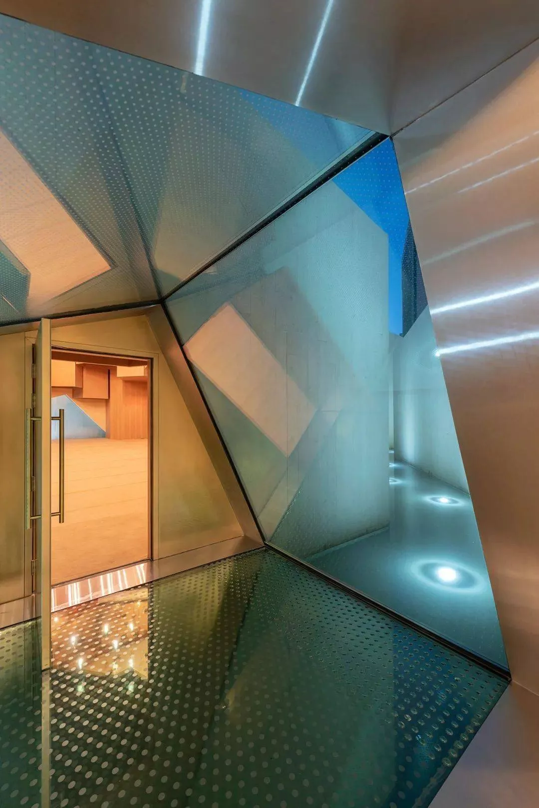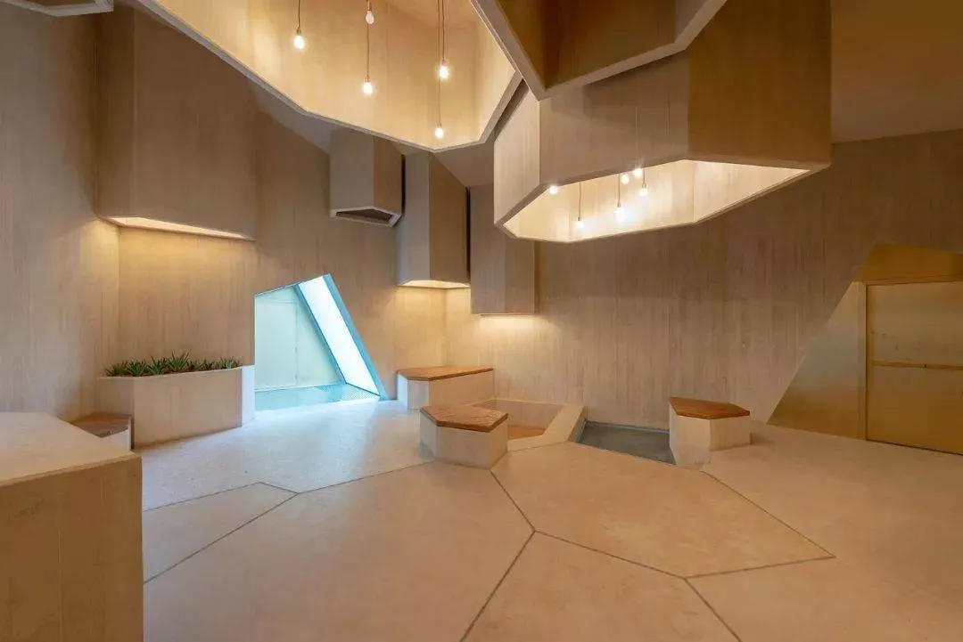 公園的幾何形狀在室內(nèi)設(shè)計中延續(xù)為吊頂設(shè)計,天花板上的圓形開口在其他封閉的空間內(nèi)點綴成了天窗。結(jié)合吊燈,它們以抽象的恒星形式出現(xiàn),讓人聯(lián)想到該地區(qū)的觀星導(dǎo)航。