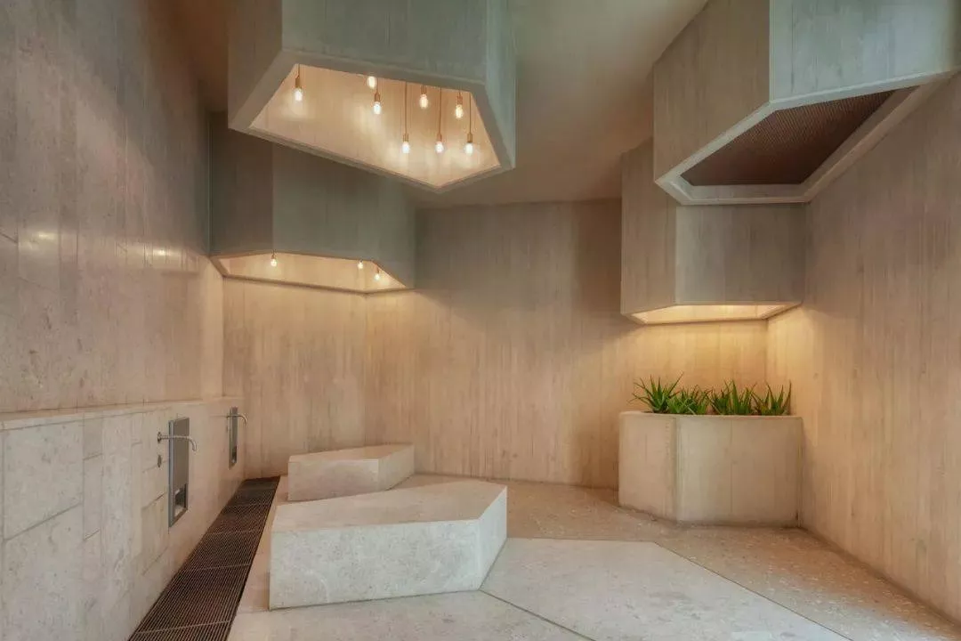 每個小建筑物都有其自身的功能,設(shè)計師計劃布局創(chuàng)建了兩個鏡像空間。女性和男性朝拜者分別沿著一系列空間前進,在這些空間中會產(chǎn)生沉浸式的精神體驗,這也遵循了祈禱的儀式。