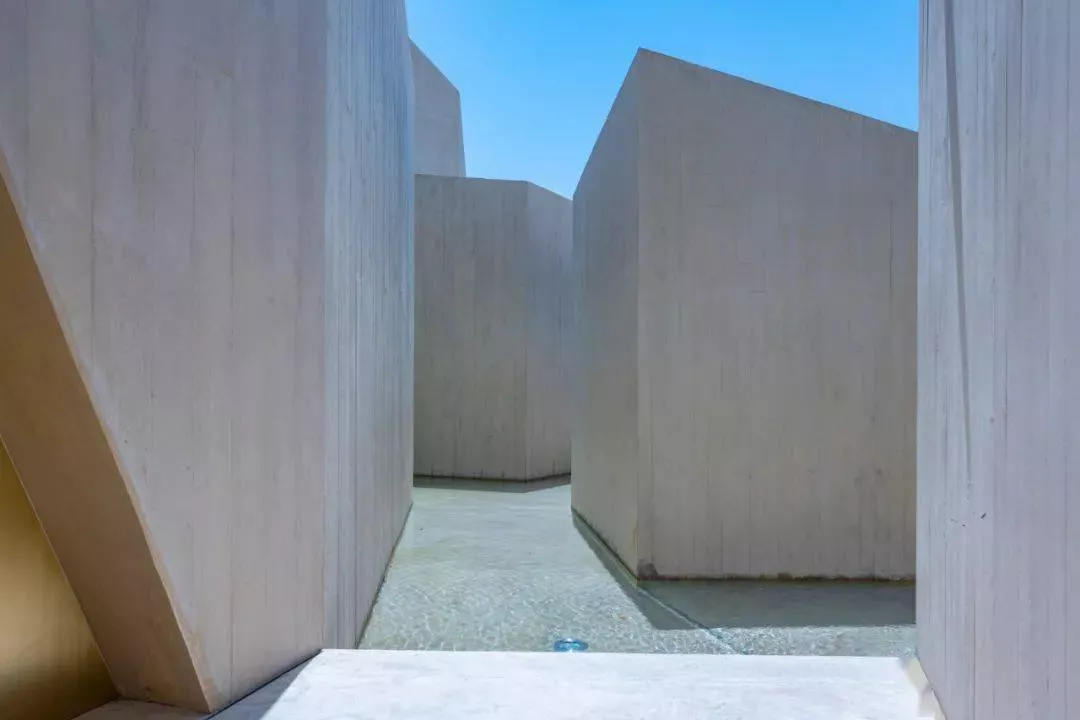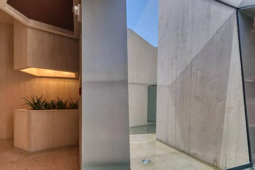 在開闊的公園景觀中沿著“巖石”之間狹窄的通道行走,城市的喧囂感逐漸消失,游客進入像洞穴一樣的入口大廳,在這里人們可以休息并在祈禱前交談。