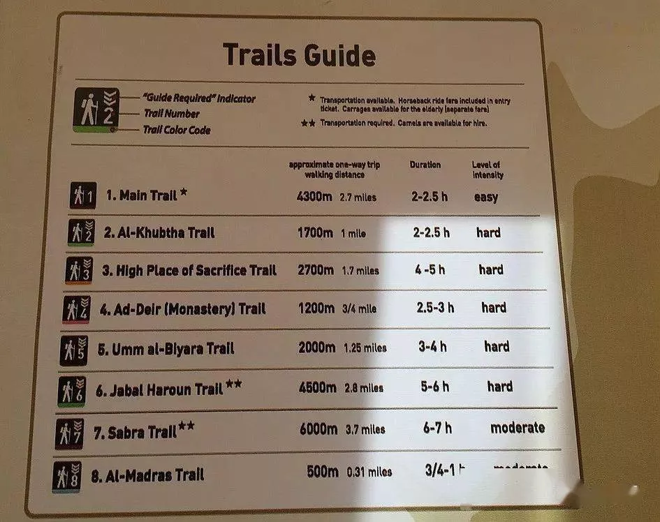 棕紅色線:Mail Trail,從中央區(qū)向右側(cè)再向右下大拐彎彎彎曲曲延伸至景區(qū)入口(圖中最右側(cè)偏下方) 嫩綠色線:Al-Khubtha Trail,在Mail Trail右側(cè)生長(zhǎng)出來(lái)的游覽線路,1700米,部分山路,需要攀爬 橙紅色線:High Place of Sacrifice Trail,在Mail Trail下方生長(zhǎng)出來(lái)的線路,一端在中央?yún)^(qū),2700米山路 粉紅色線:Ad-Deir(Monastery) Trail,中央?yún)^(qū)向右上角延伸的線路,1200米純山路 深棕色線:Umm al-Blyara Trail,中央?yún)^(qū)向下再向左拐彎的線路,2000米山路 深綠色線:Jabal Haroun Trail,中央?yún)^(qū)向左下角延伸的線路,4500米山路 棕黑色線:Sabre Trail,中央?yún)^(qū)向左下再向右拐彎的線路,6000米較平緩路 淡藍(lán)色線:Al-Madras Trail,Mail Trail最右側(cè)向下延伸出來(lái)的一條短線,500米平緩路景區(qū)入口售票處有這么一張線路指示牌,標(biāo)示出每條線路的距離以及需要花費(fèi)的時(shí)間。憑借親身體驗(yàn),我認(rèn)為指示圖上標(biāo)注的時(shí)間是單程時(shí)間。如果是平緩小路,更多在于游玩的話,時(shí)間差不多。如果是爬山的線路,腳程快的人可以比指示牌的時(shí)間縮短一半。