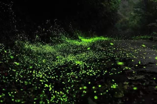 整片整片的熒光點(diǎn)點(diǎn),籠罩在一大片樹叢周圍,像圣誕樹,夢幻至極!隨手一抓,手心就握著一點(diǎn)星光,像是握住了光明和希望。