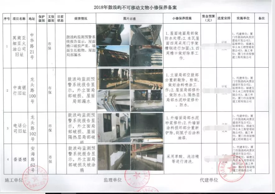 此前不久,鼓浪嶼開發(fā)公司工程部洪棟梁剛接到鼓浪嶼管委會(huì)文保處的通知?!八伲≈心香y行舊址有需要修補(bǔ)的地方?!彼焖俨榭戳藘?nèi)容,就馬上組織幾家備選施工單位的工作人員到現(xiàn)場查看??吹绞┕挝幻媛峨y色,洪棟梁耐心向大家解釋并要求:雖然這么小的工作量不好安排工人,跟大項(xiàng)目一樣也要寫好幾份報(bào)告,但不能降低標(biāo)準(zhǔn)和要求。中南銀行舊址是鼓浪嶼53處申遺要素之一,必須及時(shí)修補(bǔ)好。他說,“大家一起多幫幫忙,這樣的修補(bǔ),就只能是這樣的支出了?!苯?jīng)過與幾家施工單位反復(fù)交流溝通,現(xiàn)場把價(jià)格擬定在1000元左右。