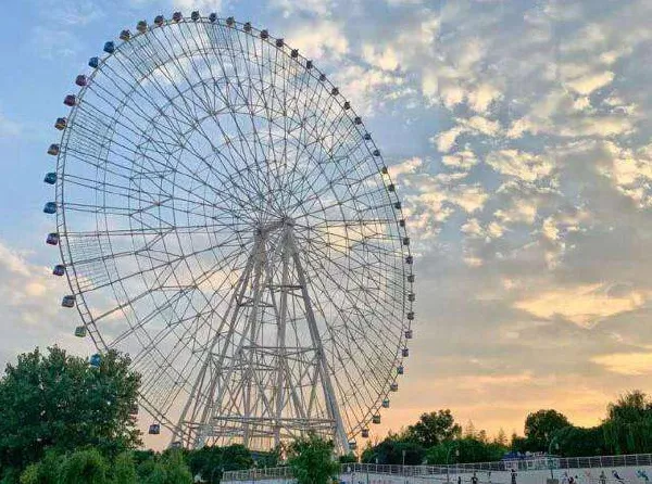 世紀(jì)歡樂園摩天輪,吊艙有56個,重達(dá)數(shù)千噸。在被鄭州市列入夜景照明工程后,鄭州市市政部門對其進(jìn)行了精心設(shè)計(jì),在該摩天輪上安裝了裝飾燈。該燈由2000多根彩色燈管圍繞直徑90多米的摩天輪組成,中間的六根菱形支柱也被變幻的燈管裝飾,無論是從高度還是燈管的長度。