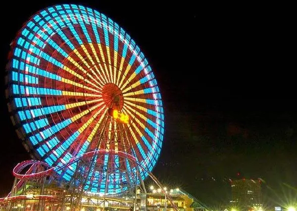 園區(qū)內(nèi)最受歡迎的是摩天輪,“宇宙之鐘21”是港區(qū)未來的地標(biāo),白天可眺望浩瀚海景,夜晚可俯視棋濱迷人的夜景。另外還有世界規(guī)模最大的急流泛舟“Greef.drop”,和世界第一部沖入水中的潛水云霄飛車“Punish”等傲稱世界的游樂設(shè)施。夜晚燈火通明,景致浪漫迷人。