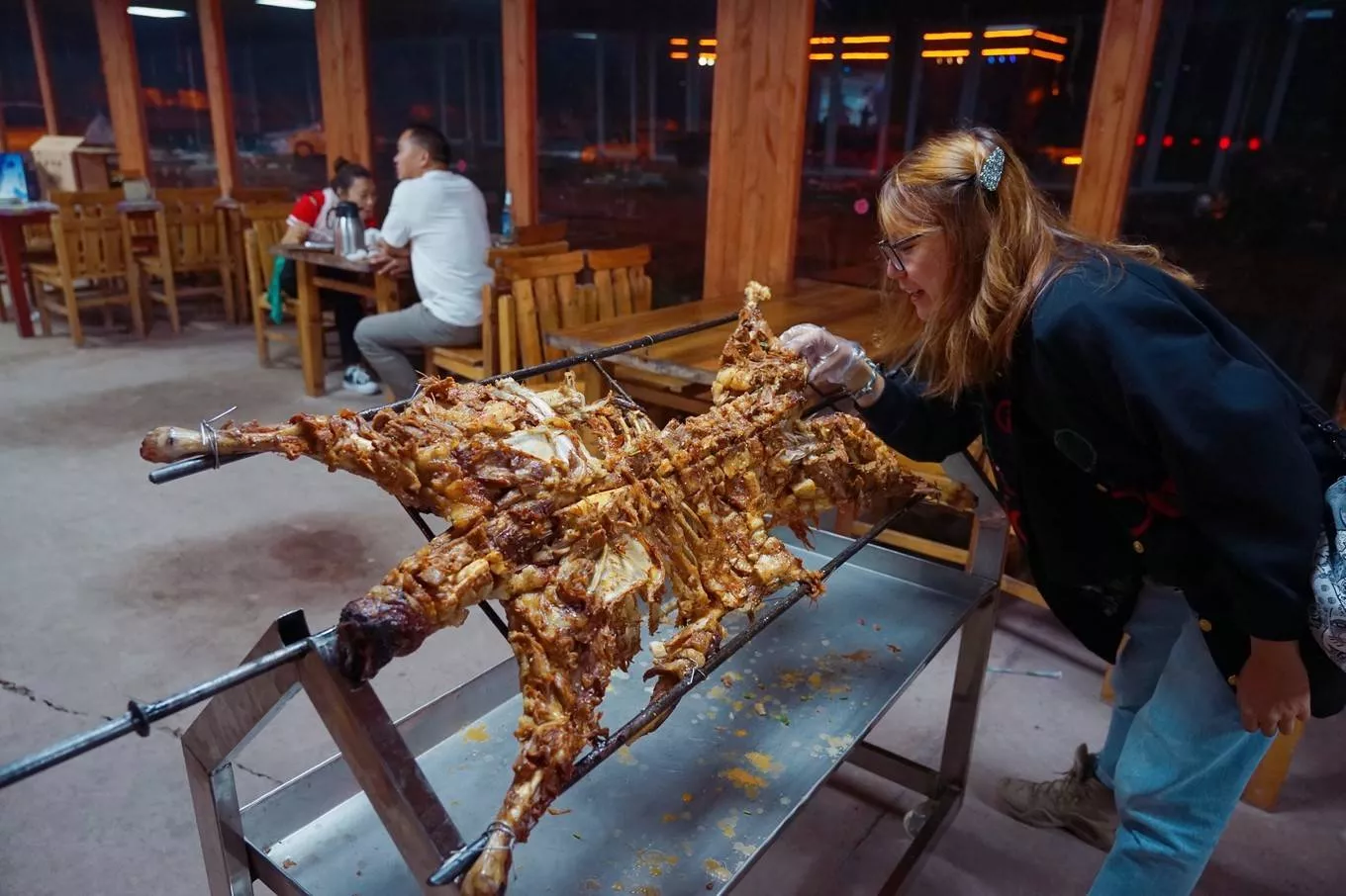 壩上草原風(fēng)味的烤全羊可以說(shuō)是采摘式吃法,需要烤制三次及吃三次。一只整羊用秘制調(diào)料腌制后明火烤制,撒上辣椒、孜然粉等調(diào)料,烤制外酥里嫩后,連烤架一起弄進(jìn)餐廳里,然后眾人用手撕著吃(這種吃法被我們稱作采摘式吃法)。