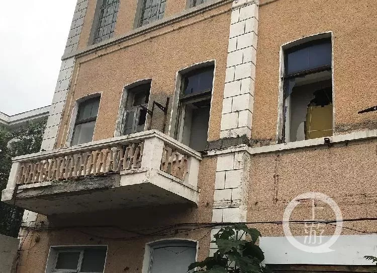 記者現(xiàn)場看到,這棟建筑的骨架還在,但被歲月洗劫得不成樣子了。側(cè)面墻上有一處明顯鼓起,可見墻體膨脹得厲害??拷箝T口的八角形門廳已被磚頭封死。二樓拱形窗戶的窗框不知去向,只剩下一個(gè)窗口。樓頂也有年久破損的痕跡。