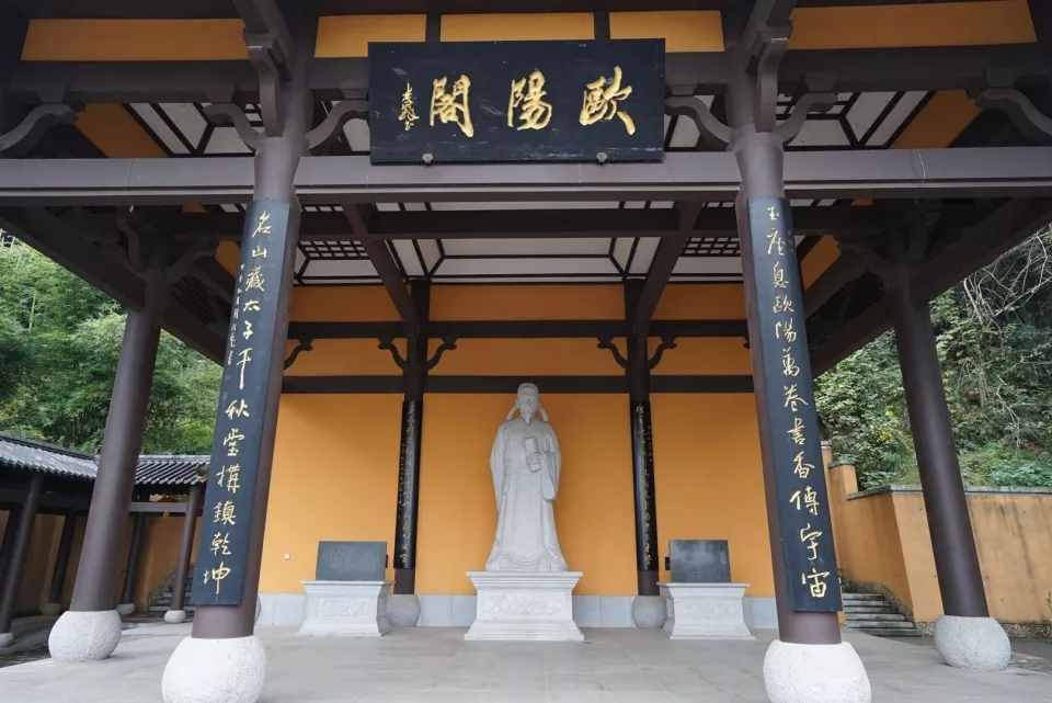 雕梁畫棟,氣派典雅的歐陽閣峙,內(nèi)有一尊歐陽詢雕像,閣前方步道上,鐫刻著多個(gè)現(xiàn)代書法家題寫的各種造型的“書”字,別具意蘊(yùn)。