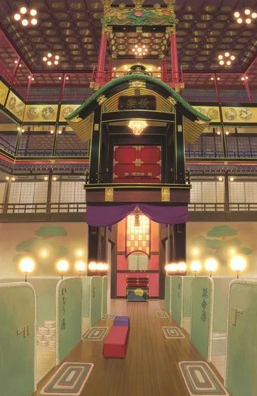 油屋的室內(nèi)設(shè)計(jì)則參考了東京的目黑雅敘園。目黑雅敘園,又稱“昭和龍宮城”,有迷之百層臺(tái)階、豪華的精美工藝、別具一格的房間。