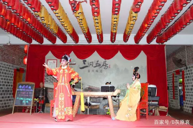 坐在“三間五房”的四合院里,主內(nèi)堂,有個小舞臺,其實該說是個戲臺,會看到演出--湛江地區(qū)的特有戲種--雷劇,可以吃美食,看雷劇,還能感受到濃濃的鄉(xiāng)土情懷。