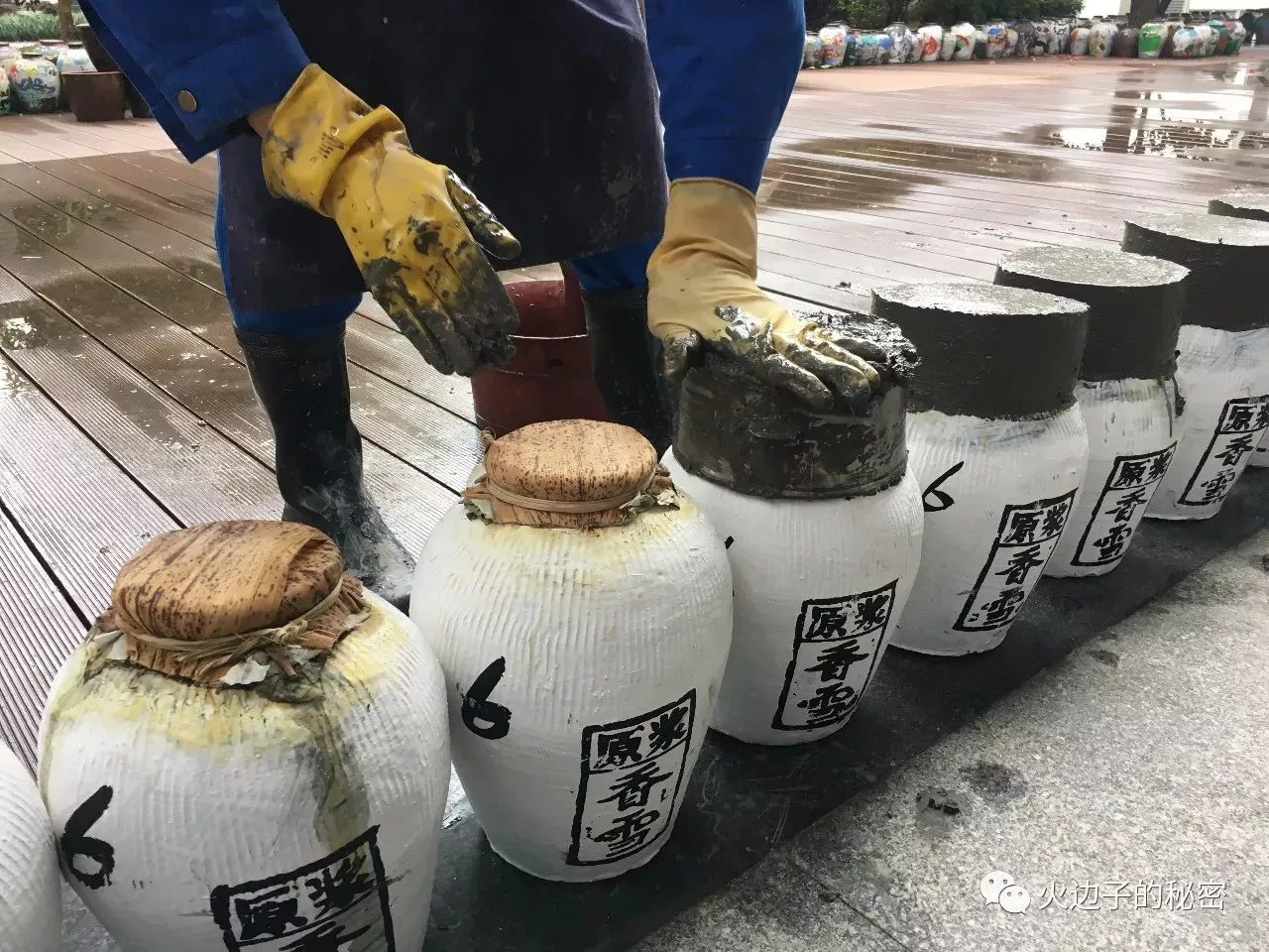 每壇酒在進行完所有的工序之后,就該封壇了,用荷葉把壇口封住,再用紹興當?shù)靥厥庹{(diào)制的封壇泥把壇口封住,一壇美酒就可以長時間的存放了。