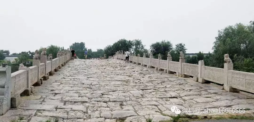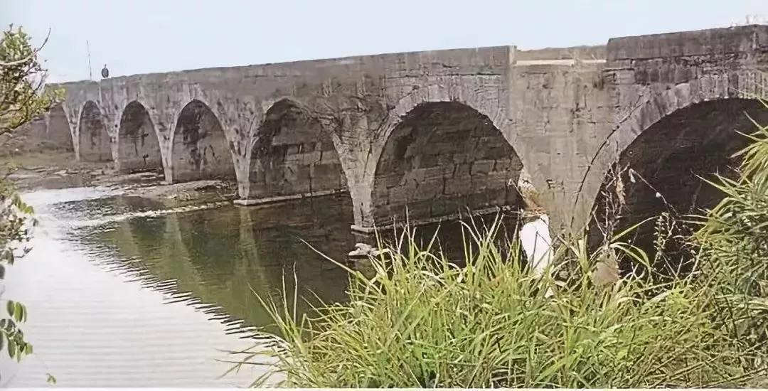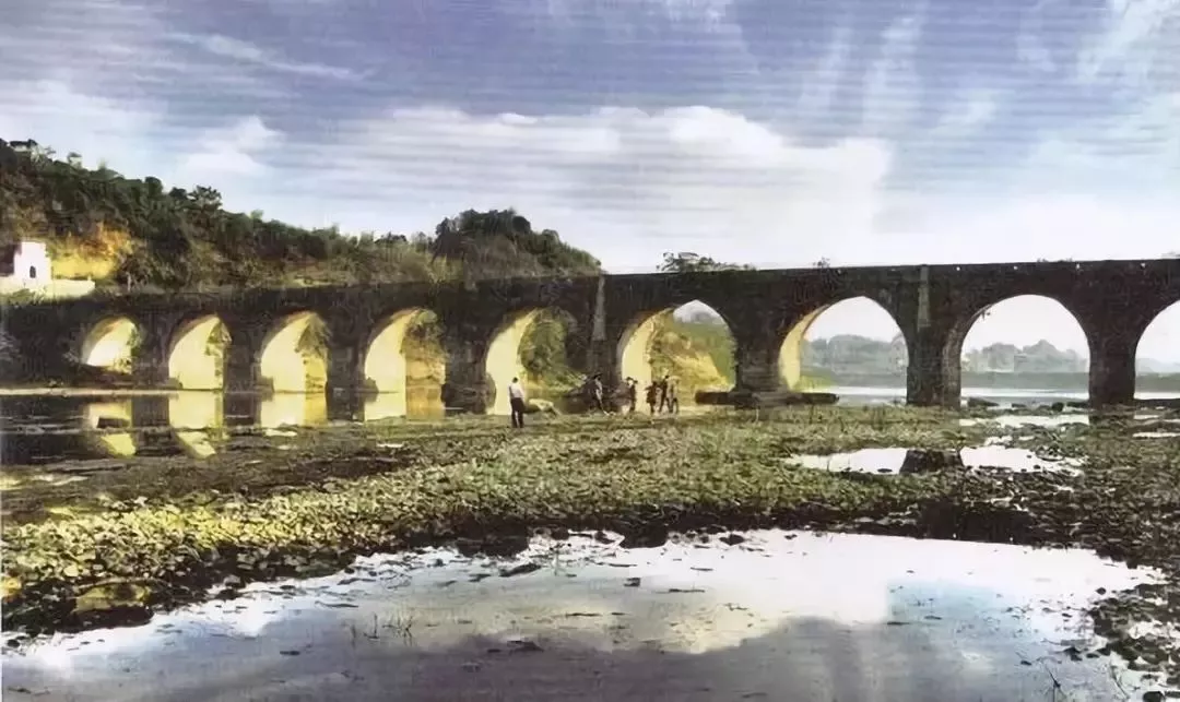 1933年,洪水沖毀南北兩孔,1935年修復(fù);1944年被日軍炸毀,1956年修復(fù)為8孔石拱橋。全長166.35米,寬10米,單孔跨徑15米。