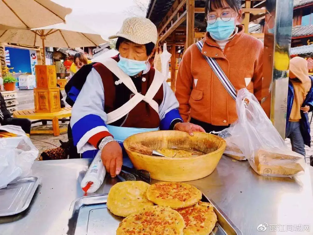 也有游客們一起前來(lái)體會(huì)這份熱鬧,手捧一塊麗江粑粑,詢(xún)問(wèn)著商戶(hù)攤位上的麗江特產(chǎn)。