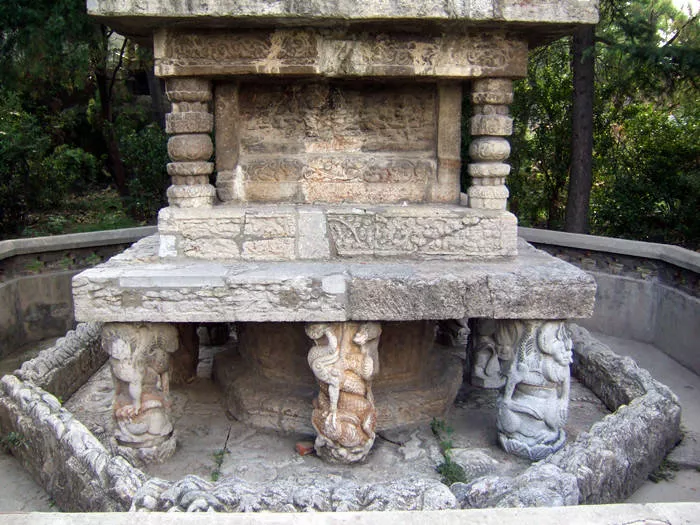 底盤:為香水海池與海壁造像,平面呈八角形,由八塊石雕組成,石幢居中。淺浮雕雕出波濤滾滾,在漩渦中有海馬、海獸等形象。海池是根據(jù)佛教的教義生死海設(shè)計的。海池的外部有池壁,上雕山巒起伏,內(nèi)側(cè)有造像,好像一幅很大的畫卷。其造像內(nèi)容主要是佛教故事,即釋迦牟尼出行到成佛的一系列故事,也有佛經(jīng)故事。