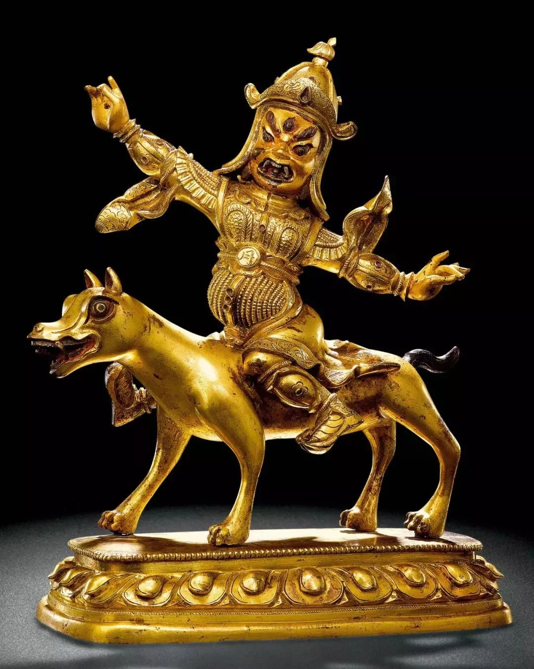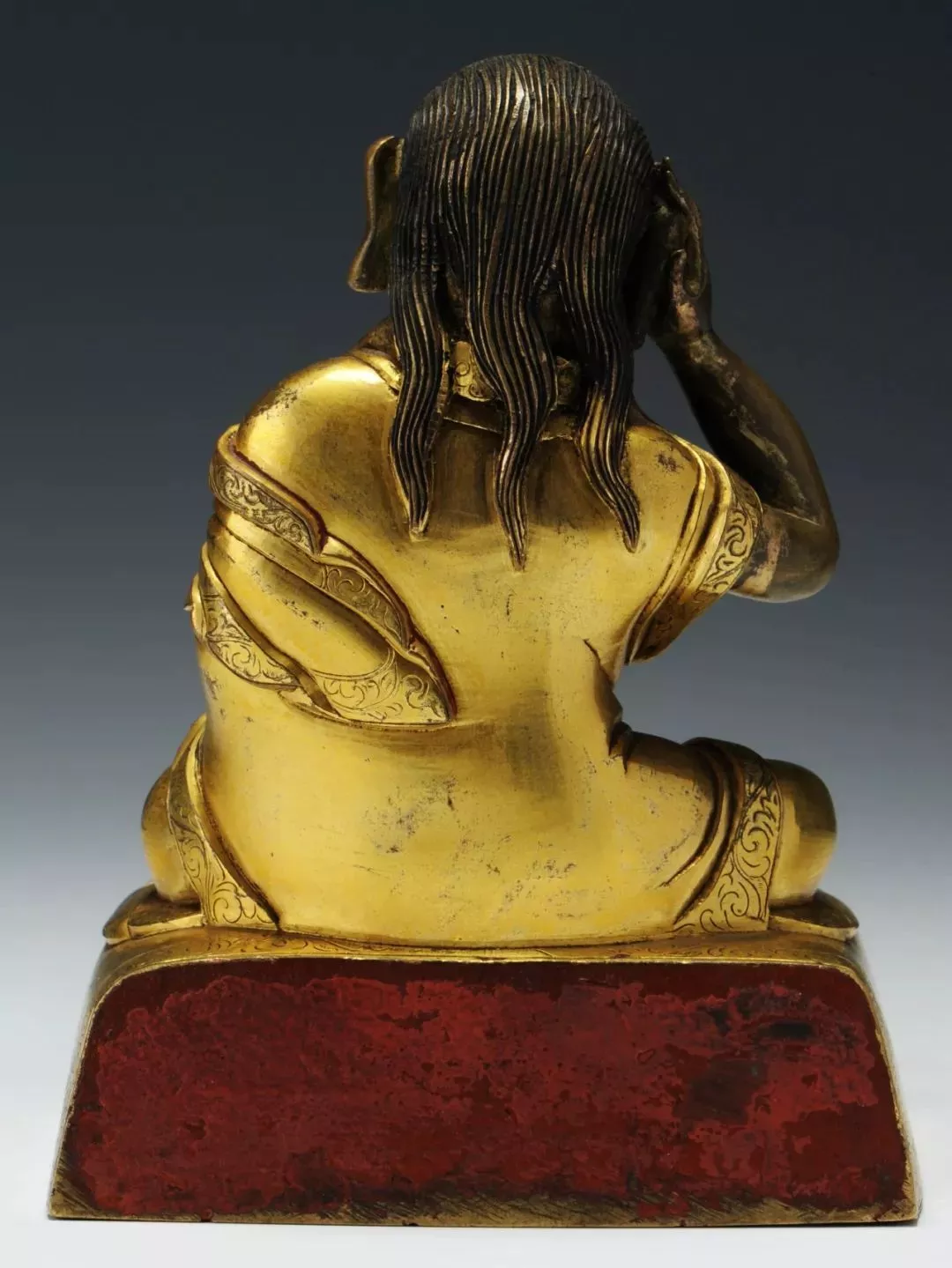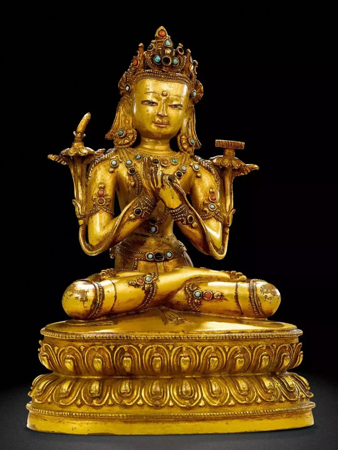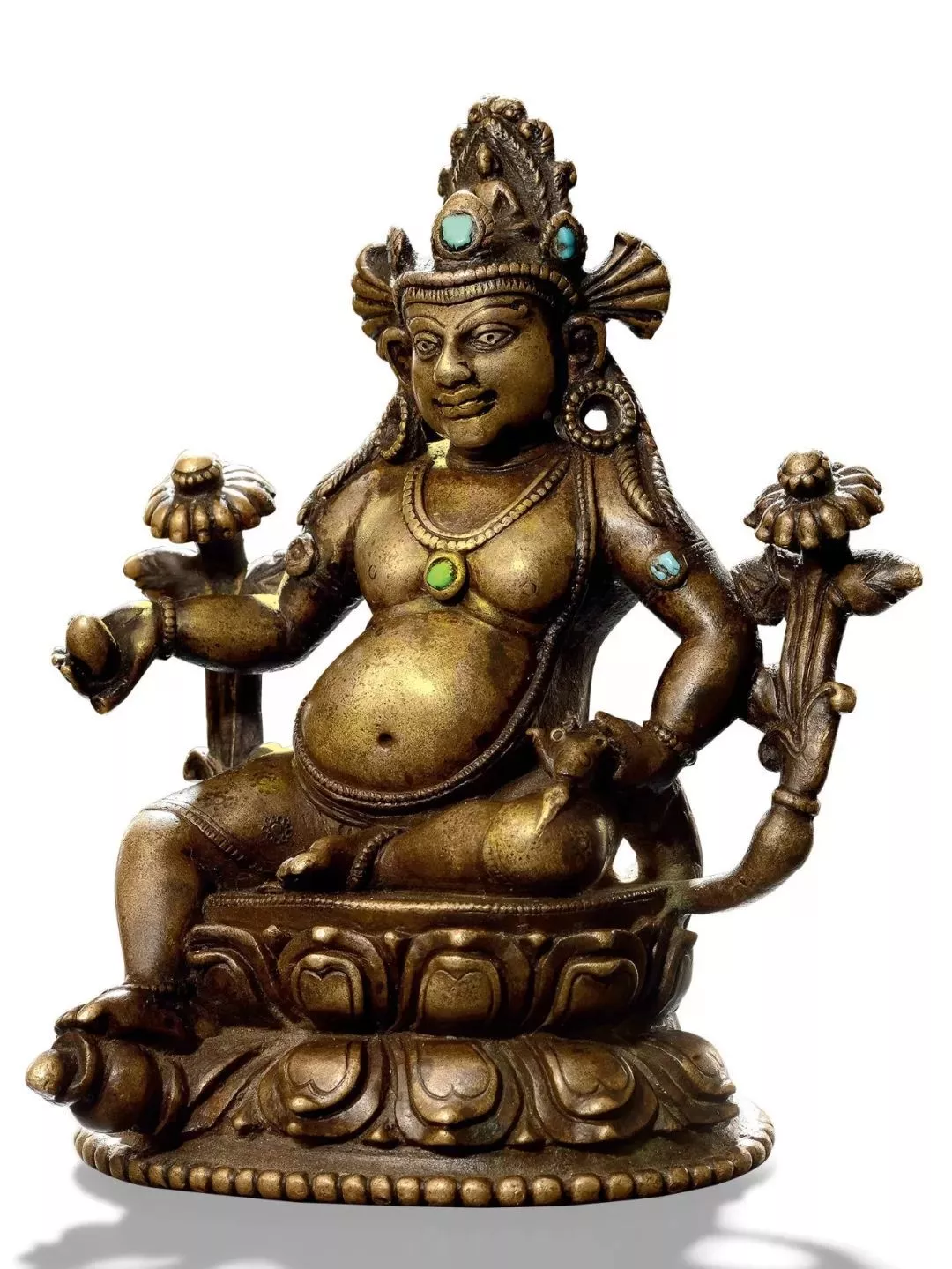 下身著裙,輕薄貼身,裙上敲刻梅花點(diǎn),采用了典型的帕拉風(fēng)格造像裝飾手法。左手握吐寶鼠,右手持布拉嘎如意寶,右足踩踏海螺寶瓶,舒坐于束腰式仰覆蓮座之上,蓮瓣較為扁平,布局舒展。此像造型生動(dòng),憨態(tài)可掬,保存完整,且裝飾風(fēng)格簡(jiǎn)約,項(xiàng)鏈和臂釧處鑲嵌的綠松石與頭冠相互映襯,為同類作品中的罕見(jiàn)佳作。