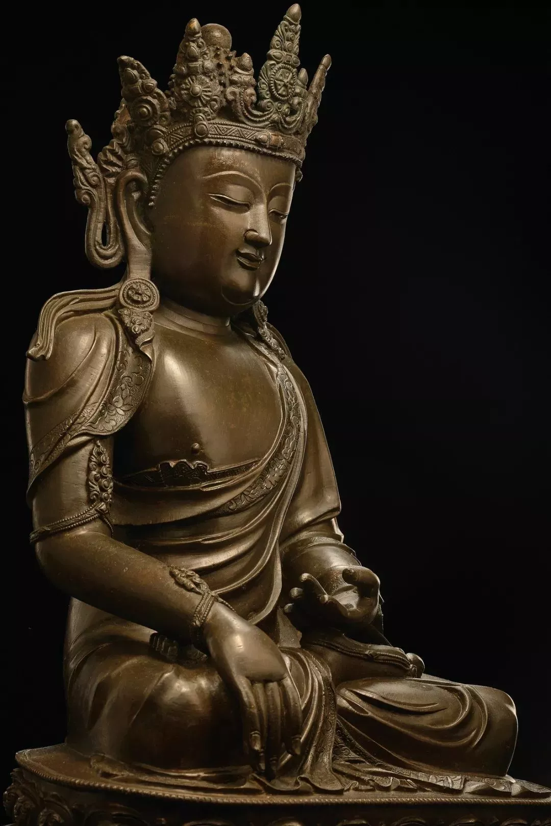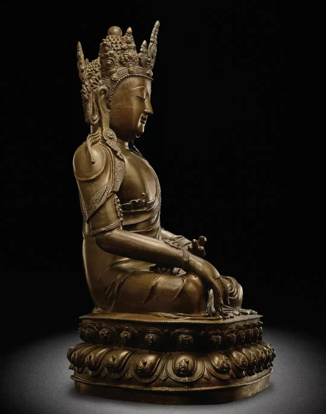 下面這尊高達(dá)42公分的阿彌陀佛造像,不僅造型端莊,法相莊嚴(yán),而且胎壁輕盈,銅色細(xì)潤(rùn),鑄工精湛,保留了原封底,是一件西藏13世紀(jì)造像藝術(shù)的代表作。