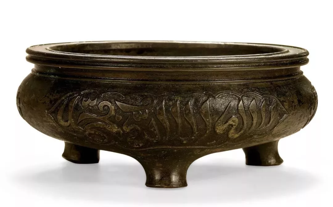 伊斯蘭書法在伊斯蘭藝術(shù)中無(wú)所不在,一些日常生活上實(shí)用的物品如瓶、爐、盒等,書法內(nèi)容多為可蘭經(jīng)或贊美真主阿拉等為主。此爐束頸,鼓腹,粗乳丁狀足。腹上三開(kāi)光內(nèi)淺浮雕阿拉伯文作飾,底部中央刻“大明宣德年制”六字楷書款,此爐銅質(zhì)厚重,樸實(shí)簡(jiǎn)潔,制式規(guī)范。