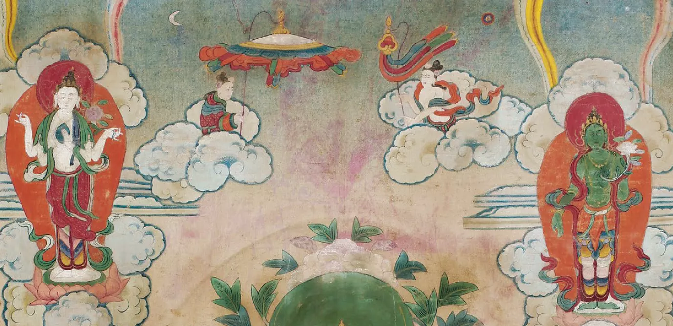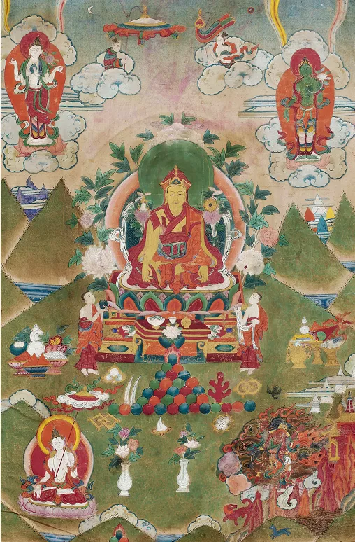 法王頭戴班智達(dá)法帽,面形消瘦,眉眼平直,嘴含微笑,容貌安詳。上身著無(wú)袖僧坎,外披紅色袈裟。雙手自然下垂,手中拈有花莖,左右兩肩分飾法輪和金剛鈴杵。下身穿寬松僧裙,雙腿結(jié)跏趺坐。畫面上方有供養(yǎng)天女,綠度母和四臂觀音呈現(xiàn)站姿,立于祥云之上。