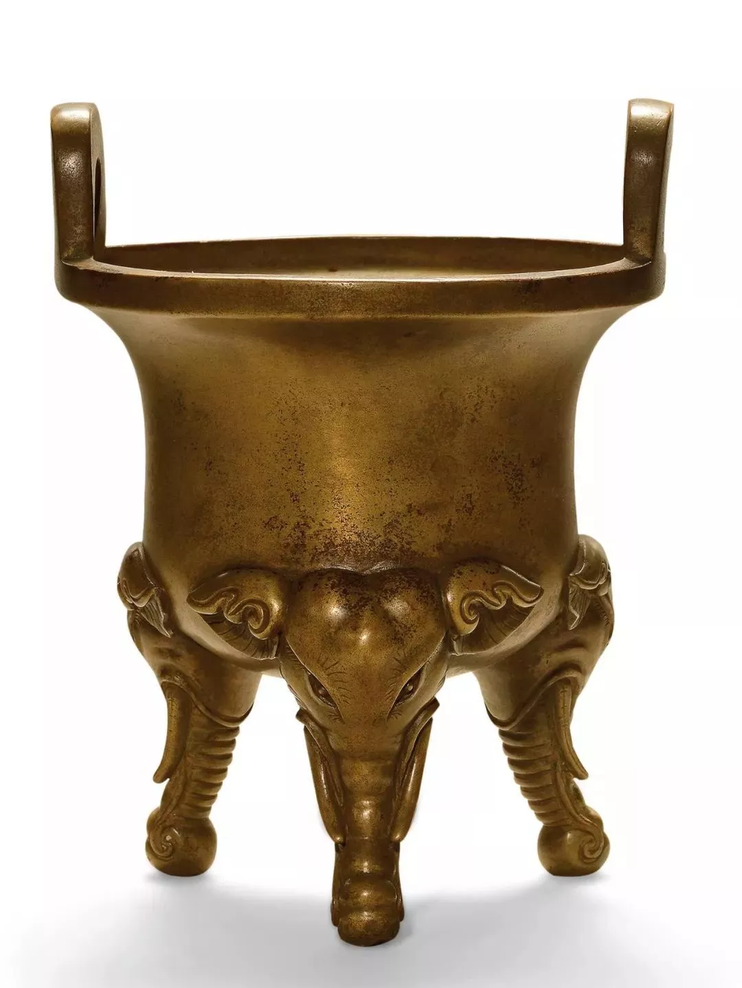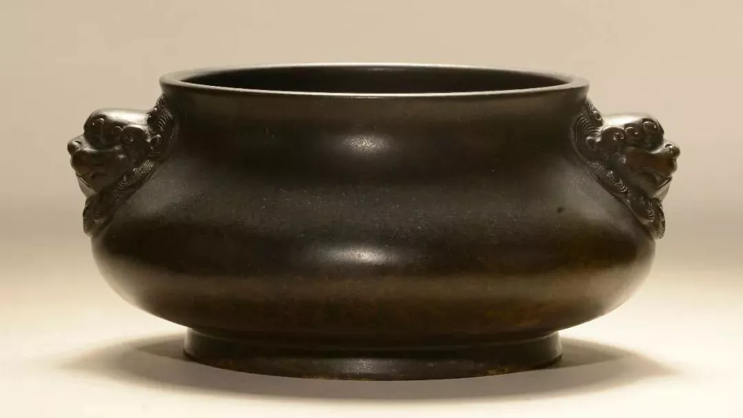 獅耳爐又稱“獅頭爐”,其型仿自宋代哥窯瓷爐之款式,宣德帝最早制此爐常御賜兵部尚書與高層軍職要員,以率六君之統(tǒng),故以獅首為飾,取其威猛之意。