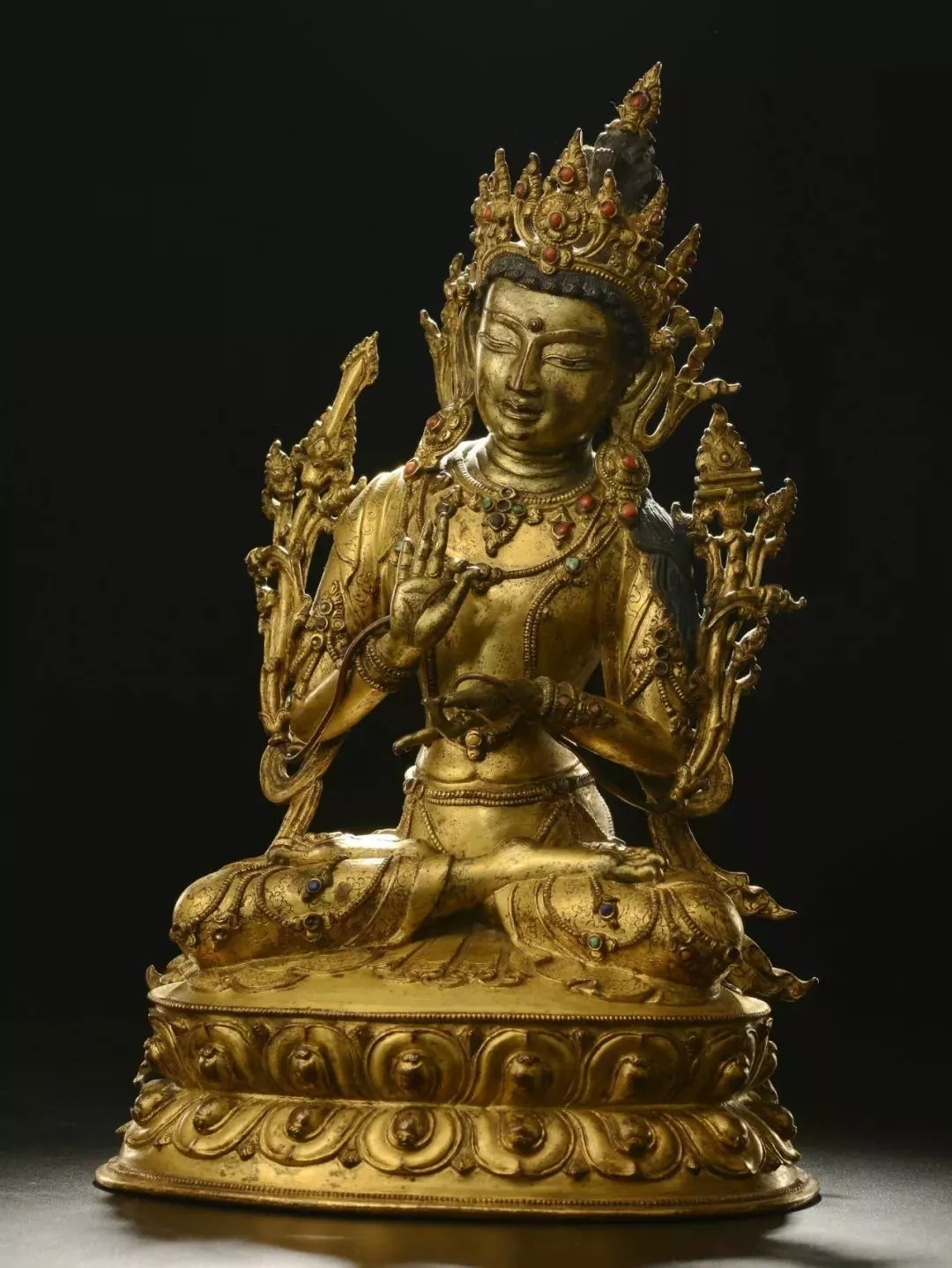 此尊造像頭戴小三葉冠,其樣式源于犍陀羅地區(qū),是東北印度帕拉王朝時(shí)期流行的冠式之一。冠葉鑲嵌綠松石,發(fā)髻高聳,頂現(xiàn)化佛。據(jù)此推斷,此件作品為佛教題材,是西藏早期仿帕拉風(fēng)格造像。面龐圓腴,眼睛嵌銀,瞳孔居中,雙唇微啟,呈現(xiàn)出祥和喜悅之相。袒胸露腹,體側(cè)分別綻放兩莖烏巴拉花。周身配飾耳環(huán)、項(xiàng)鏈、長(zhǎng)珠鏈、手鐲、臂釧和腳鐲。