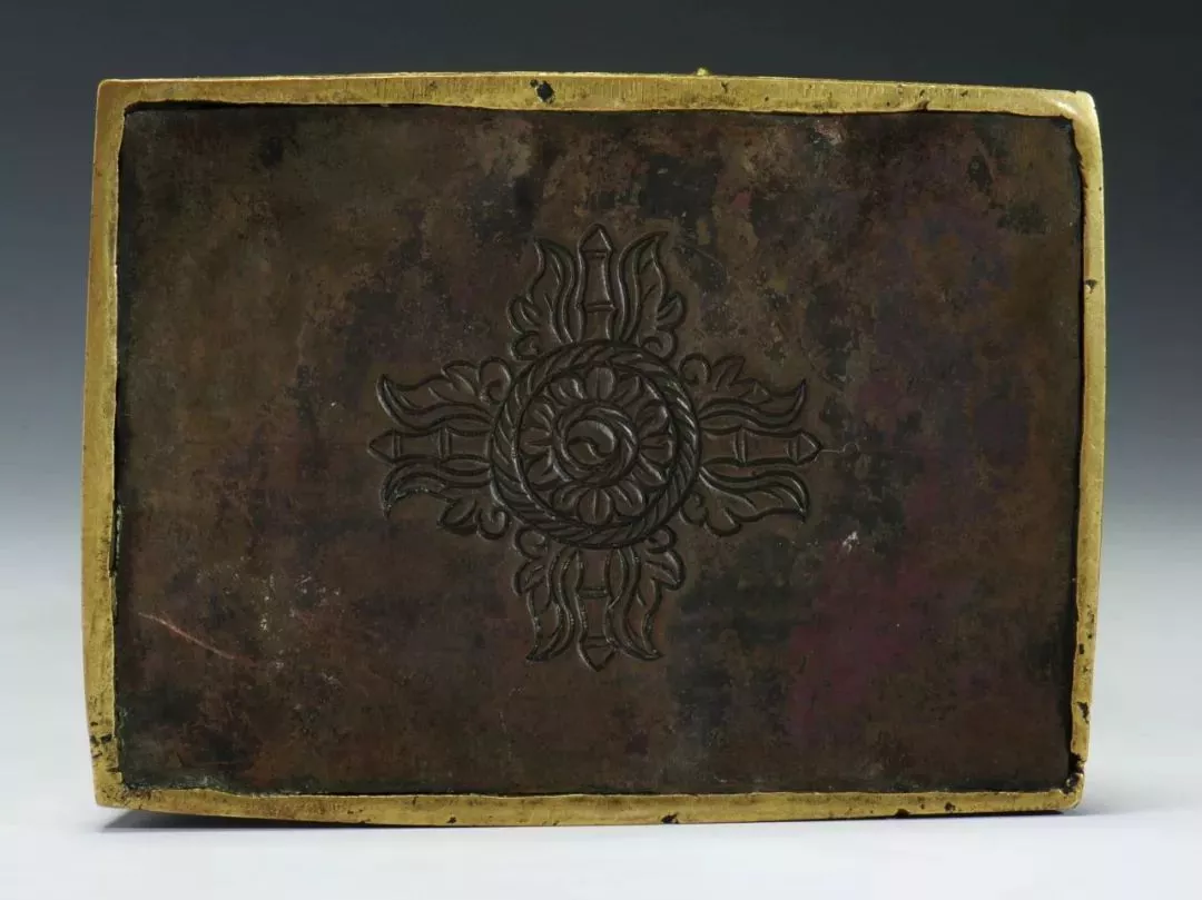 精銅為材,入手厚重,藏經(jīng)色。平口沿,微束頸,鼓腹,下承三乳足。外底落“玉堂珍玩”四字篆書款。原配如意足銅座。整體素雅沉靜,線條流暢,為壓經(jīng)爐中之精品。
