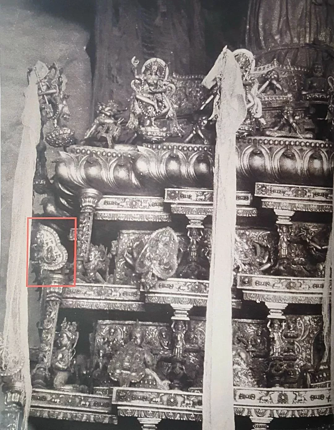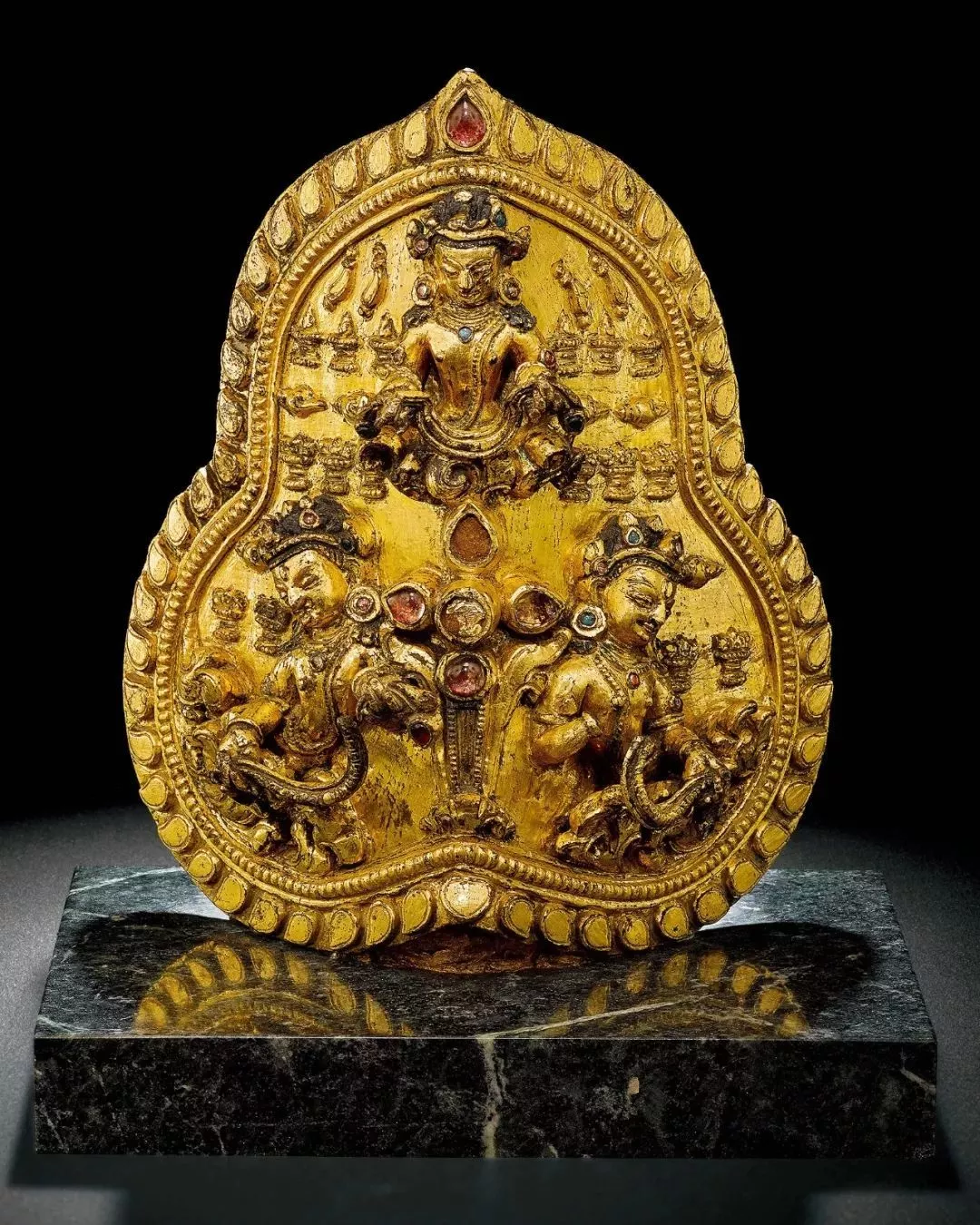 此件佛塔的整體造型復(fù)古,保存完整,線條流暢古樸,為標(biāo)準(zhǔn)的噶當(dāng)塔器形。塔由臺(tái)座、塔基座、塔身以及塔剎四部分組成。最底為仰覆式蓮臺(tái)形制,雙層蓮瓣錯(cuò)落有致,寬厚飽滿,瓣尖略微上翹。其上為覆缽形塔瓶,腰身以弦紋兩道裝飾,塔瓶之上是多角平臺(tái)。再向上又為逐漸收分的圓形十三天,圓形華蓋的邊沿下垂一圈精美的流蘇。塔頂飾有吉祥的日月寶焰及綬帶,莊嚴(yán)華美。