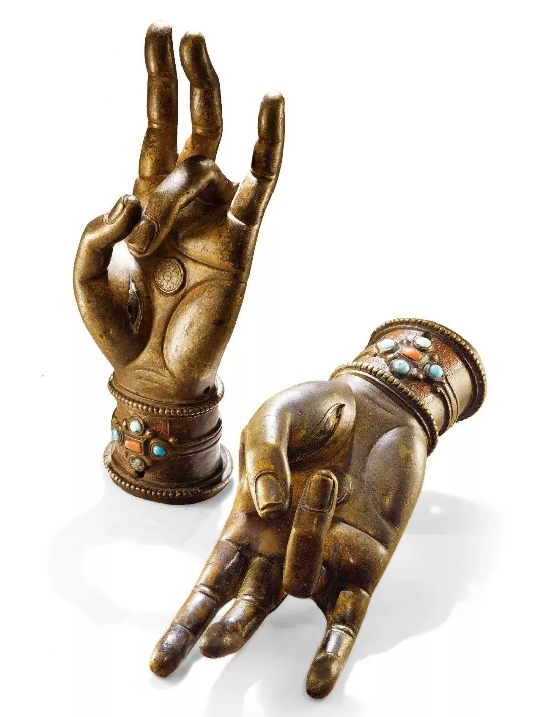 此對(duì)佛手應(yīng)來(lái)自一尊分體鑄造的大體量佛像。手腕釧環(huán)上下各飾一道聯(lián)珠紋,內(nèi)嵌紅銅并陰刻蓮花圖案,圖案中央東南西北中五方嵌有五顆各色寶石。雙手結(jié)施依印,亦稱護(hù)法印,即拇指與無(wú)名指結(jié)成環(huán),其他三指向上直伸,圓圈象征著施依是方法和智慧的結(jié)合,三個(gè)直伸的手指代表佛、法、僧“三寶”是所依之物。藏傳佛教的神祗系統(tǒng)中,度母的各種化身或觀音菩薩常結(jié)此手印。