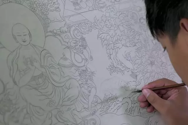 熟知《造像》后,唐卡畫師才真正開(kāi)始學(xué)習(xí)繪制唐卡。從打磨畫布、研磨顏料,打底稿、上色、勾線、開(kāi)眼,又是一段時(shí)間漫長(zhǎng)的學(xué)藝之路。