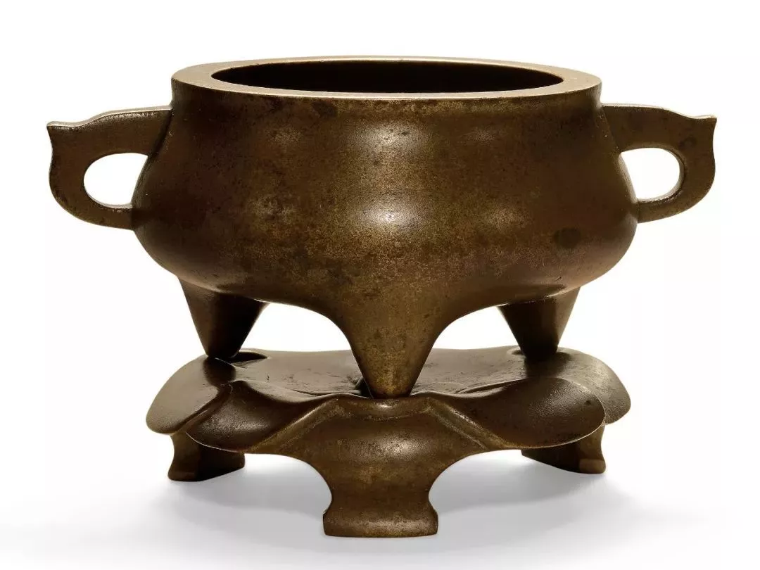 此爐型似敞口的茶盞,又如初綻的花朵,線條舒展流暢,造型優(yōu)雅大方,銅質(zhì)精純細(xì)膩,三獸足外包三分之二狀,底刻“大明宣德年制”楷書款,歲月滄桑之下,也難掩其光華。