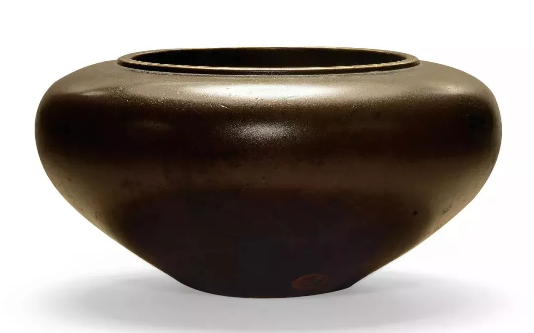 平底,底中央刻“大明宣德年制”六字楷書款,通體光素?zé)o耳,器壁厚薄適中,皮色沉穆潤(rùn)澤,撫之柔膩,蓋因精銅煉鑄所致。