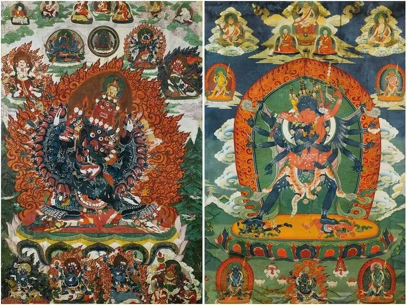 左側(cè)唐卡中的主尊為空行母,全身袒露,六臂皆執(zhí)法器,上面兩手持弓箭,中間右手持鉤,左手持繩,兩端是環(huán)和鉤,胸前主要兩手,右手持鉞刀,左手持嘎巴拉碗。身體呈舞立姿勢(shì),左腿單立,足踩一人,或以尸為墊;右腿盤曲。背后為紅色火焰,四周眾護(hù)法眷屬圍繞。(107×67.5cm.)