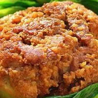 蒸制這種肉的腌菜是修水人自制的芥菜干,修水人稱為腌(鹽)菜干。取上等帶皮五花肉放沸水中煮至五成熟,撈起后擦去皮上油水,趁熱抹上醬油,切成6~7厘米長,1厘米厚的片,注意皮不要切斷。將水發(fā)芥菜干鋪碗底,切幾個小尖椒,大蒜頭鋪上,再撒上姜未、胡椒粉,加料酒、精鹽等佐料,再將肉皮朝下壓在干菜上,用碗扣住上籠蒸熟。取出時翻扣至盤內即可。特點是色赫味香肉熟爛,食之不膩,干菜咀嚼有味。