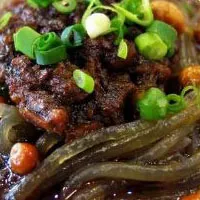 主料:粉絲約85克,肉絲約180克,甘筍絲、榨菜絲各1湯匙,冬菇4只,清水6杯,韭黃約85克。配料:調(diào)味料:豆瓣醬1湯匙,鎮(zhèn)江醋2湯匙,鹽1/2茶匙,鮮露1湯匙,生抽1茶匙,麻油少許。做法:1、粉絲用清水浸半小時(shí),略剪短度。2、肉絲加生抽1茶匙,生粉、麻油各半茶匙拌勻。3、冬菇浸軟去蒂,切絲,韭黃切段。4、清水煮滾加入肉絲及冬菇絲,候再滾起即將粉絲、甘筍絲、榨菜絲及調(diào)味料加入,再滾時(shí)灑上韭黃,即可。備注:韭黃不用煮太久,否則失去香味而且會(huì)變韌。