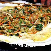 2. 煎餅鏊子燒熱(火要緩而均勻),左手盛一勺米糊倒在鏊子中央,右手用煎餅扒子盡快把米糊向順時(shí)針?lè)较蛲崎_(kāi)成畫(huà)餅形,這時(shí)再把攤好的面糊用刀推勺后約用1分鐘即熟。用刮刀順邊刮起煎餅的邊緣,兩手提邊揭起,餅薄加紙,呈棕黃色,松軟筋道,微酸甜香。