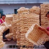 柳條加蒲草、藤草混編而成的工藝品,色澤潔白、造型別致,主要有果籃、花籃、掛籃、門(mén)簾、屏風(fēng)等。