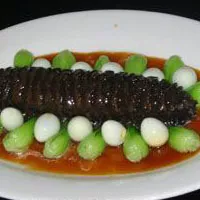 ③燒熱鍋,下油,放入鵪鶉蛋,炸成淡黃色撈起。再燒熱油鍋,用蔥熗鍋后將蔥結(jié)撈起,故入雞脯肉、海參煸炒幾下,下料酒、雞湯,將鵪鶉蛋倒入并下口蘑,調(diào)味,用生粉水勾芡,淋香油,放入蔥段即可。