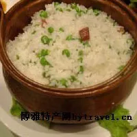 云南省四季如春,常年時鮮蔬菜不斷。隆冬季節(jié)青蠶豆、青豌豆等蔬菜上市,所謂青蠶豆米即尚未完全成熟處于生長期的綠色蠶豆,剝?nèi)蓪油鈿?,留下的肉仁,自然翠綠鮮嫩回甜。每年春節(jié)期間青蠶豆或青豌豆上市,民間都做豆?fàn)F飯嘗新的習(xí)俗。豆?fàn)F飯是選用剛摘下的鮮嫩蠶豆,剝殼去皮留下豆米,熟火腿切成指甲大小的片,再把上米摻入二分之一糯米掏洗干凈,煮熟控出米湯。鍋上火,先把火腿炒香,加入蠶豆米,加精鹽,味精和上湯,再倒入米飯,蓋在蠶豆和火腿上,用小火將湯燜干,稍后將下面的火腿和蠶豆米與上面的米飯拌勻即成。這是一道菜飯合一的品種,外觀呈白、紅綠三色,協(xié)調(diào)美觀,誘人食欲。入口后,肉香、豆甜、飯糯,云南火腿系我國三大名腿之一,蜚聲中外,膾炙人口,鮮嫩蠶豆米青香回甜,在外地實難得品嘗到。加之由糯米和飯米滲合的米飯,確是一大風(fēng)味特色,久吃不厭 ( 曲靖)