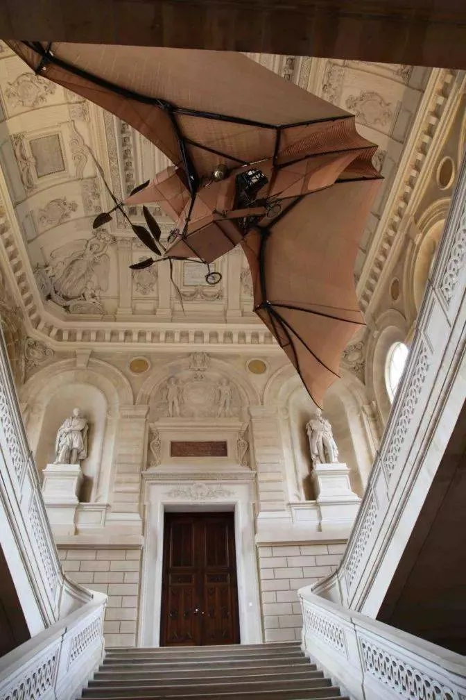 一樓與二樓之間的樓梯間,空中懸掛著一個1893-1897年間的飛行器,機翼模仿蝙蝠