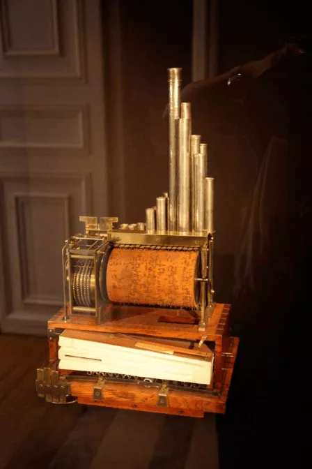 1819年的機械驅(qū)動的管風琴,其原理與上述機械“唱片”類似。滾筒上的凸起可以用來控制管風琴的開關(guān)。