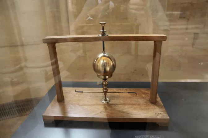 一種仿古希臘蒸汽機的演示反作用的裝置,將壓縮空氣釋放時,可使銅球轉(zhuǎn)動。裝置設(shè)計者為法國物理學(xué)家馬略特(Edme Mariotte, 1620-1684),1829年復(fù)原。