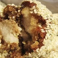 聞喜煮餅是一種山西省的地方傳統(tǒng)名點(diǎn),正宗聞喜煮餅多產(chǎn)于山西省運(yùn)城市聞喜縣,在山西有著餅點(diǎn)之王的美譽(yù),又有國式糕點(diǎn)絕產(chǎn)之美稱。在晉南民間把“炸”就叫“煮”。主要原料為面粉、蜂蜜、小磨香油、糖粞及上等紅白糖等。聞喜煮餅形似圓月,由于外皮粘滿白芝麻,所以外觀是月白色。其外裹芝麻,滾圓狀,內(nèi)有栗色、絳白二色分明的餅餡,可拉出幾厘米長的細(xì)絲,吃起來酥沙香甜、不皮不粘不膩,久不變質(zhì)。