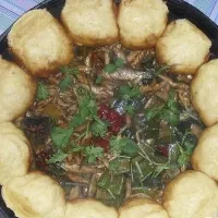一鍋出樸實(shí)、簡單的鄉(xiāng)土菜。當(dāng)然主菜可以改成魚、牛肉、排骨、雞肉等等,也可在鍋邊貼上一圈死面小花卷,吃起來特別有味道。沒有矜貴的材料,沒有靚麗的裝飾,沒有特別的調(diào)味,只需用家常的扁豆、土豆或者茄子,再放上一些剩下來的紅燒肉或燉排骨,澆入湯汁,鋪上面卷,耐心等待吧!待湯汁濃稠,面卷也完全吸收了湯汁中的香濃滋味,揭開鍋蓋的那一刻,一定會給你帶來最為單純的滿足!