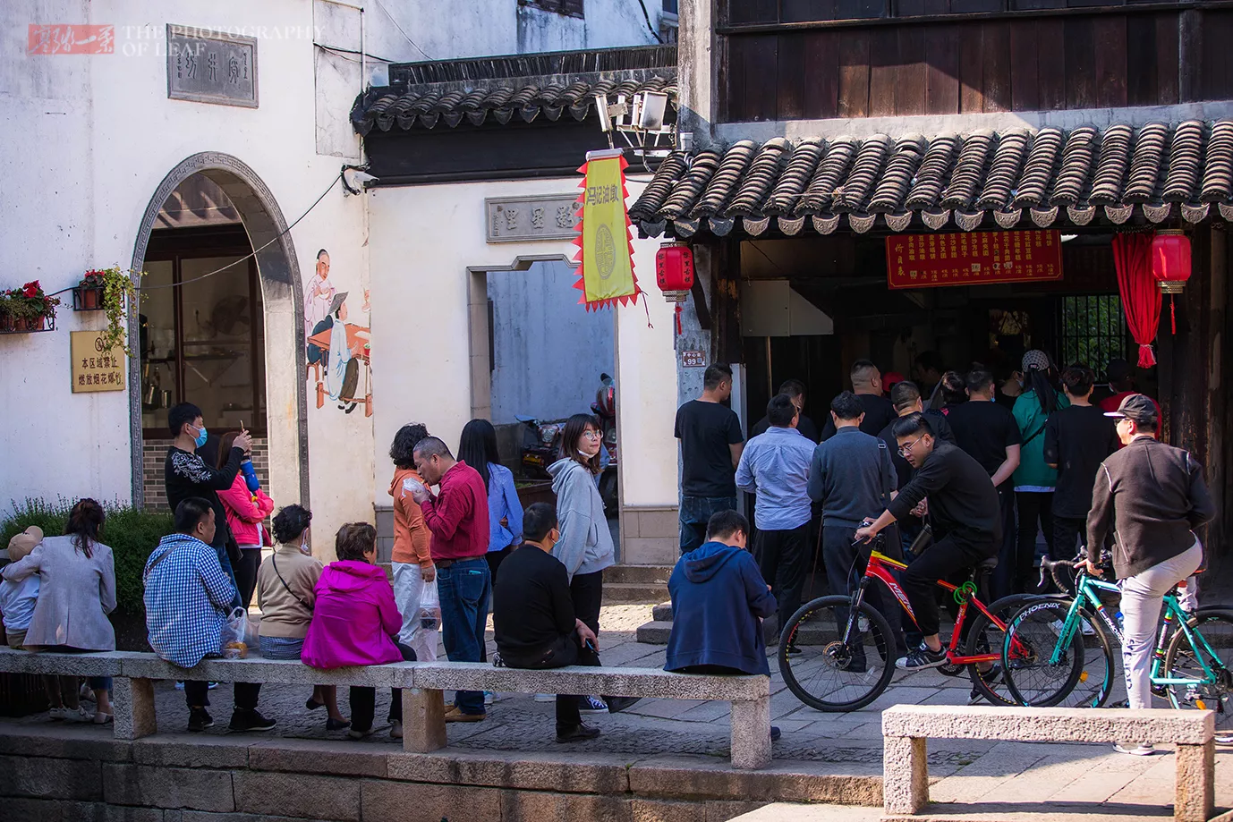 這家店的門面剛好在黎里古鎮(zhèn)風(fēng)景區(qū),青石板鋪成的道路映著古舊的招牌,油墩的歲月感一下子就出來了。也不知從什么時候起,油墩成為了黎里風(fēng)頭最勁的小吃,冬日的暖陽中,店門口的隊伍已排到了旁邊的一家絲織品店前。