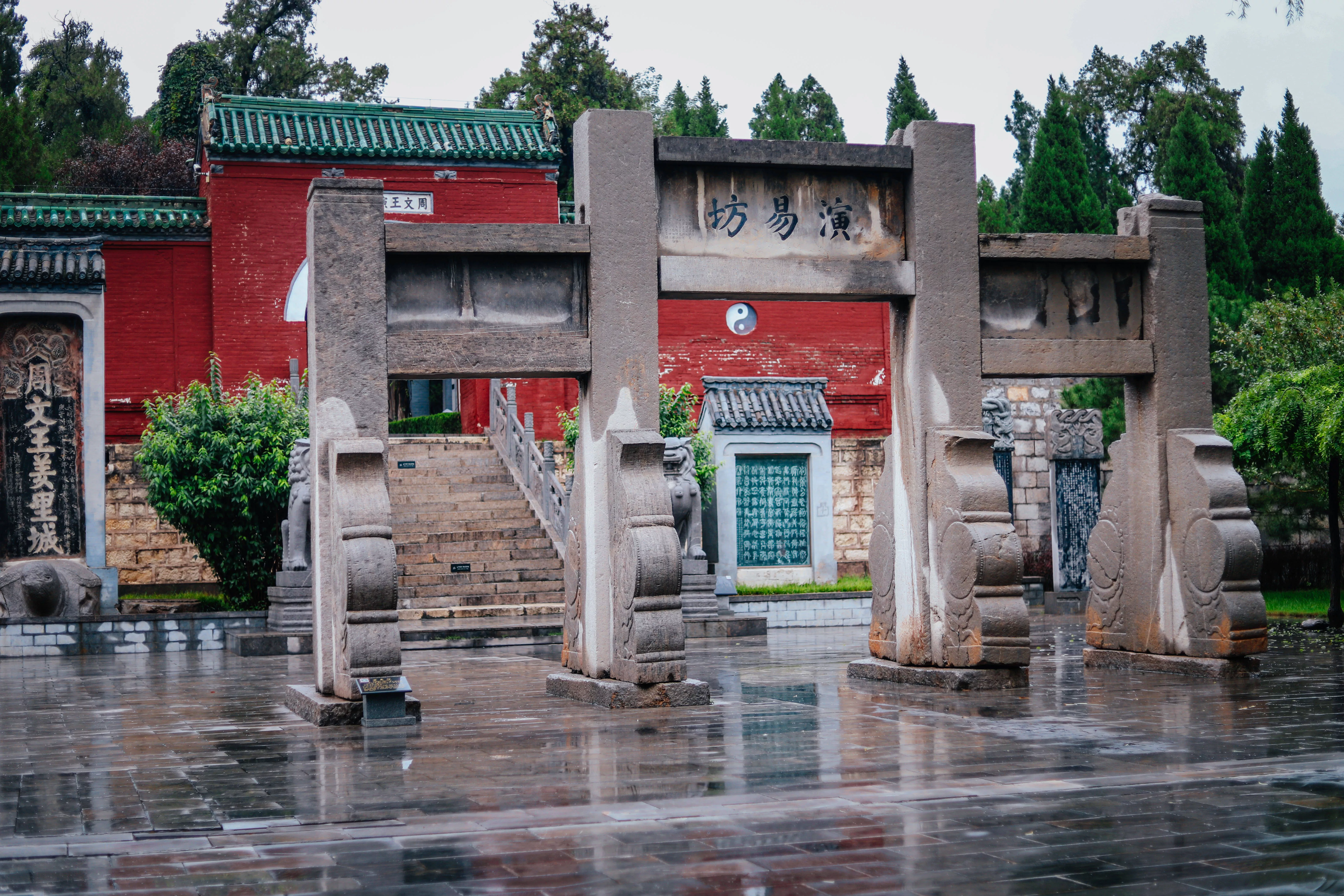文王廟文王廟建在羑里城遺址之上,座北朝南,現(xiàn)存建筑系明嘉靖二十一年(1542年)重建。在城臺(tái)的南下端,建有青石牌坊一座,上鐫楷書大字“演易坊”。山門前兩側(cè),各有碑石一通。西側(cè)巨碑上刻“周文王羑里城”6個(gè)如斗大字。東側(cè)方碑,則是著名的“禹碑”(又作《岣嶁碑》),凡77字,其書法非符篆,又非繆篆,頗為奇特。拾級(jí)而上,山門巍峨屹立。參天的古柏布滿了廟院。院內(nèi)西側(cè)便是演易臺(tái),相傳這里是西伯姬昌被囚演