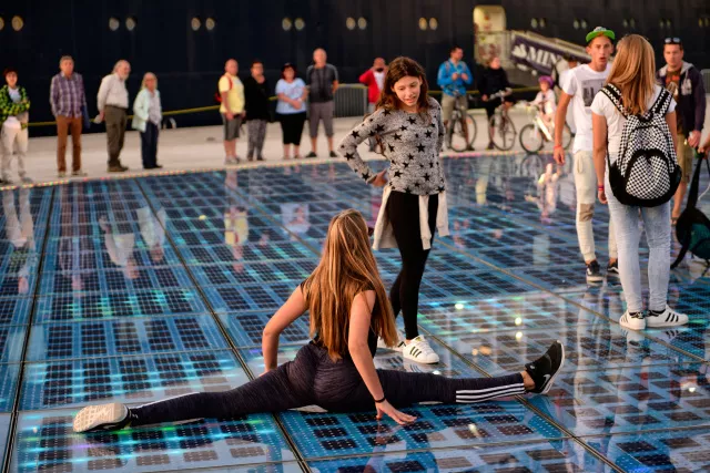黃昏時分同是周邊學生們放課的時間,三五成群來到海邊,在巨型的太陽能光板上極盡所能,力圖吸引來游客和伙伴們的目光。
